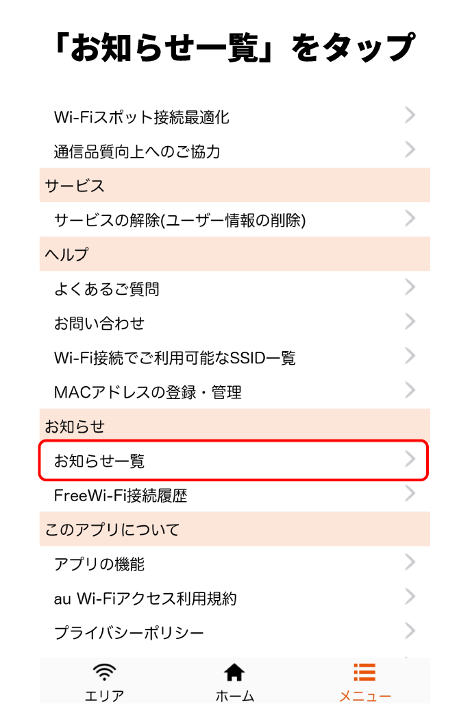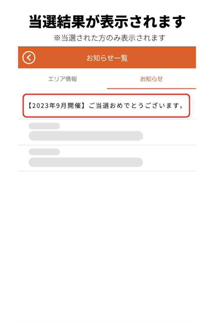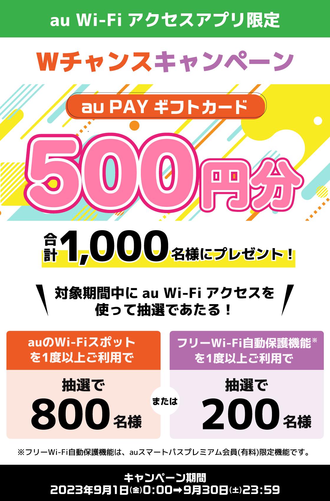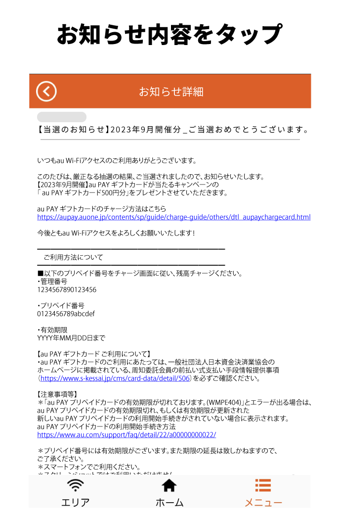 2023年10月中旬目処に、当選された方にau Wi-Fiアクセスアプリのお知らせ(メニュー > お知らせ一覧 > 「お知らせ」 > 【抽選プレゼントのお知らせ】2023年9月開催)を掲載いたします。